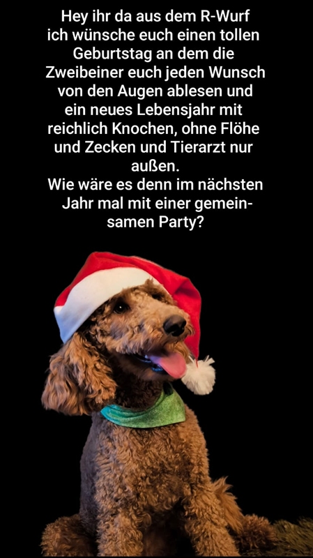Mögen euch die Knochen nie ausgehen, euch Läuse und Zecken verschonen, ihr den Tierarzt nur von außen sehen und die Zweibeiner endlich verstehen, wenn man intensiv und lieb schaut, dann könnte ruhig mal ein Stück Fleischwurst vom Tisch fallen.....
