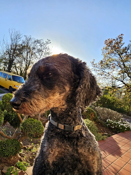 Der Püdel im Gegenlicht. Wir haben den Vorgarten schön gemacht und genießen noch ein bisschen die Abendsonne. 🍹