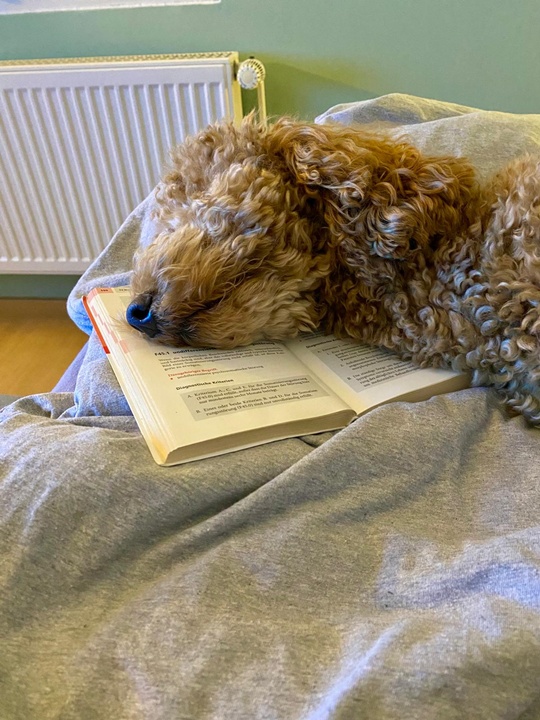 Beim Arbeiten ist Fini allerdings keine besonders große Hilfe - entweder sie liegt mit dem Kopf auf der Tastatur oder wie auf dem Foto, auf dem Buch, das ich in dem Moment brauche 😂