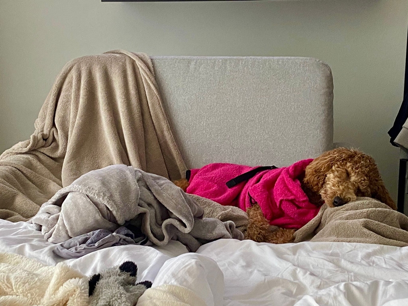 Wir sind froh, dass wir ihren Regenmantel und den Bademantel eingepackt haben 😄 Fini hat mittlerweile eine Widerristhöhe von 45 cm, wiegt dabei 8,5 kg. Wir warten auch noch auf die Pubertät 😅 sie macht das hier im Urlaub auch total klasse - morgens beim Frühstück und abends im Restaurant liegt sie ganz lieb zwischen uns auf ihrer Decke, hat entweder eine Kaustange oder schläft einfach - wir sind sehr stolz auf sie ☺☺ wie macht sich eure Emelie? Liebe Grüße von uns an euch alle 🐩
