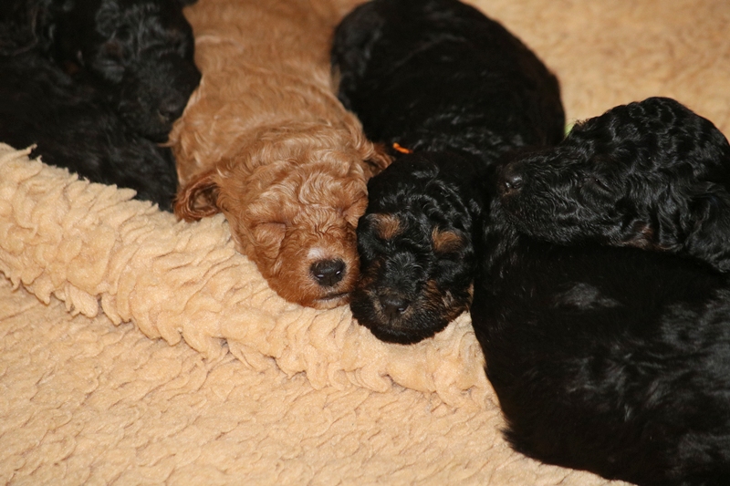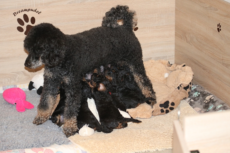 Am liebsten säugt Mathilda ihre Bande jetzt im Stehen. Sie mag es nämlich gar nicht, wenn ihr ihre Kids über ihren Kopf laufen. Es erfolgt sofort eine Zurechtweisung und die Welpen verstehen es auch deutlich.