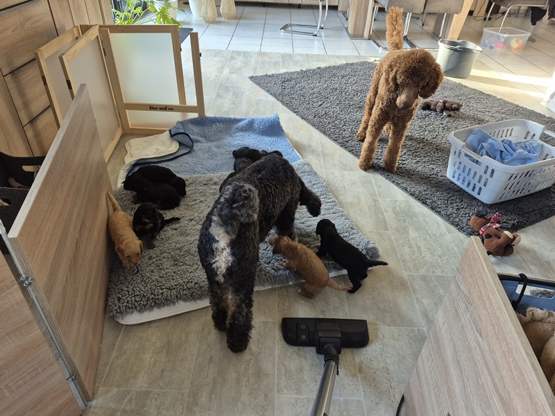 Wir haben in der letzten Woche zweimal den Welpenauslauf vergrößert und bei allen bisherigen Würfen hat es gefühlt länger gedauert, bis sie die ,, große" Welt erobert haben.