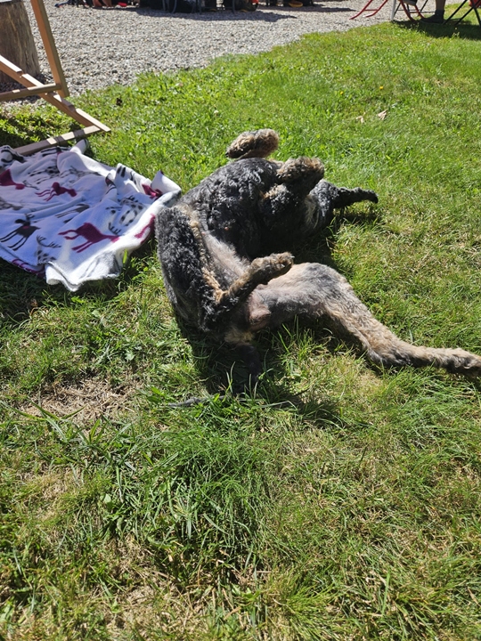 Und Geschenke gab´s natürlich auch, alle zum Aufessen.Heute waren alle ganz müde, aber ich wollte raus. Wir sind dann auf den Berg in die Sonne gefahren und ich durfte auf der Mauswiese hüpfen. Hey Bonnie, hast Du gehört? Ich hab´ auch eine Mauswiese. Und natürlich einen Hirschwald. Ich weiß nur nicht, was ich damit anfangen soll, Du musst mir da nochmal Tips geben. Aber wir sehen uns ja nächste Woche wieder und dann machen wir das Siebengebirge unsicher und Du zeigst mir all das, was Peter mir nicht verraten will.