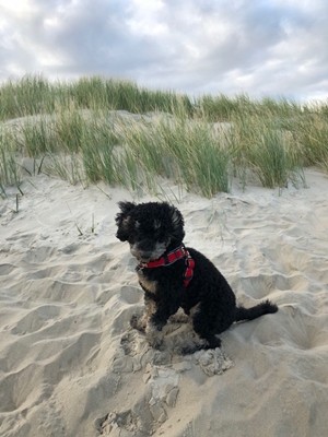 Wir schicken herzliche Grüße aus unserem ersten Urlaub mit Joko!Die Autofahrt und Überfahrtnach Norderney mit der Fähre hat er toll gemacht.Heute war er zum ersten Mal am Strand und er ist tatsächlich etwas wasserscheu... Ansonsten fand er Buddeln und Toben toll. Allerdings hat er zu viel Sand gefuttert, den musste er dann mal eben loswerden :-)...Joko ist einfach zauberhaft und bereitet uns und den Menschen und Hunden, denen er begegnet, viel Freude.Liebe Grüße und bis bald