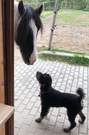Joko unterwegs mit Hundekumpel und Frauchen dahinter auf dem Pferd
