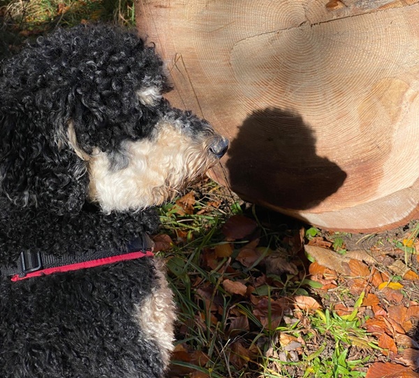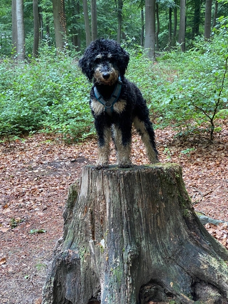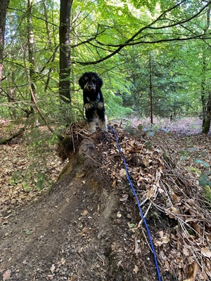 Sein täglicher Waldspaziergang ist das Highlight am Morgen. Rennen, schnüffeln, Tannenzapfen erbeuten sind seine Lieblingsbeschäftigungen. Dabei schaut er aber immer, ob wir auch in der Nähe sind.