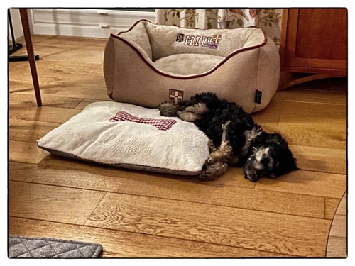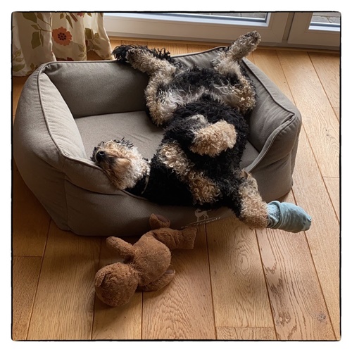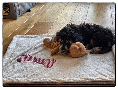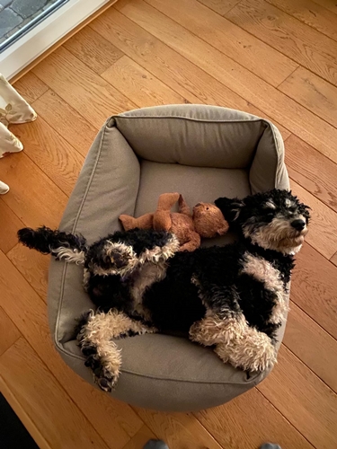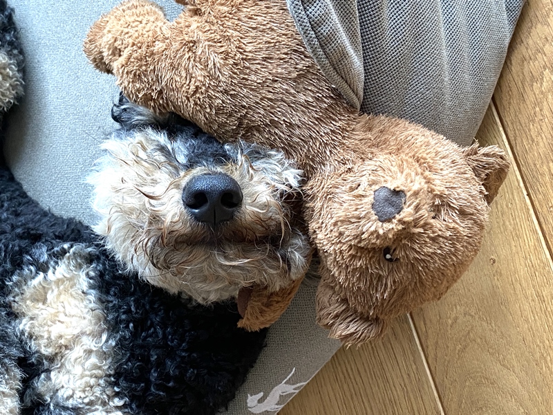 Im Haus ist er einfach klasse, ein großer Schmuser und seinen Teddy schleppt er immer in sein Körbchen um dann in den verrücktesten Stellungen zu schlafen.
