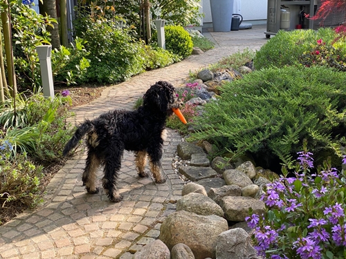 Lenny hat sich gut eingelebt. Das Haus gehört ihm und im Garten ist er der Chef. Er unterstützt nach Kräften die Arbeit der Wühlmäuse.