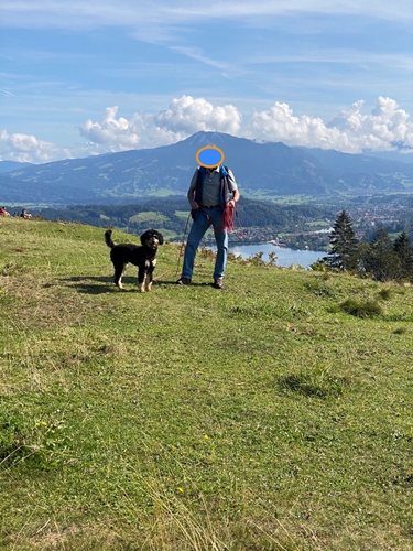 Den ersten Urlaub in den Allgäuer Bergen hat er gut überstanden. Zwischen den Kühen durchlaufen fand er ein wenig spooki, da klappte bei Fuß gehen super…Er ist nach wie vor ein Charmeur, findet die meisten Zweibeiner und Hundekumpel einfach nur toll und zum hinspringen.