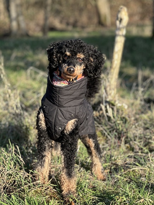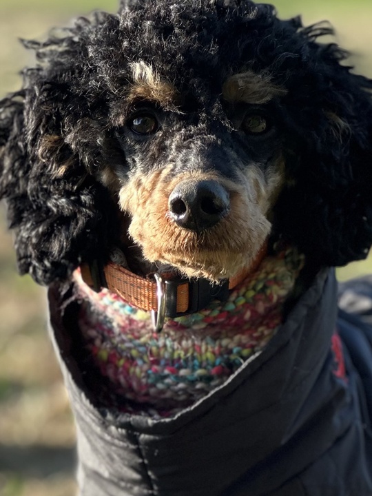 Auch im Fahrradanhänger lässt Minna sich umherfahren. Wenn sie Frauchen im Blick hat, ist es noch besser :-)