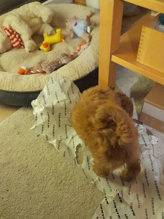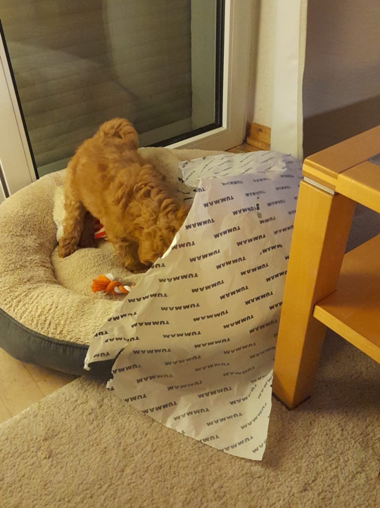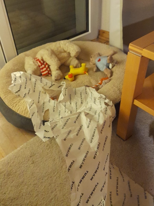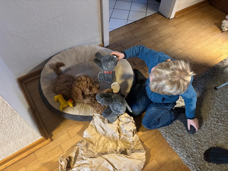 Vorhin haben wir das Überraschungspaket geöffnet und einen kleinen Qiekhund darin gefunden. Nö, der muss erstmal Franzis Interesse erregen. Das hübsche Bärchen von dir ist akzeptiert. Im Garten ist sie heute schon einige Meter ohne mich unterwegs gewesen, dann dreht sie sich um, lacht mich an und kommt zurück gesaust. Es ist so ein Glück ihr beim Spiel zu begegnen. Sie hat sich schon getraut, mir ein Zerrspielzeug zu stibitzen und damit wegzuhüpfen. Gefuttert hat sie gern und ausführlich. Jetzt liegen wir beide wieder auf unserem Lieblingsplatz, Sofa mit Kuscheldecke.