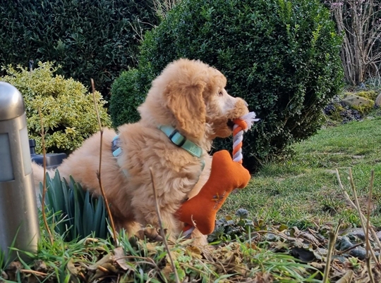 Zu Hause im Garten. Klopfe dir auf die Schulter und sei stolz. Der kleine Tayo ist ganz offen auf Thomas zugegangen obwohl er ihn überhaupt nicht kennt, und Geräusche machen ihm auch überhaupt kein Problem.