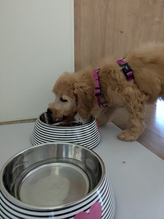 Lotta schmeckt das Fressen im neuen Zuhause schon 🥰 und das neue Spielzeug auf der neuen Matte ist auch schon super.