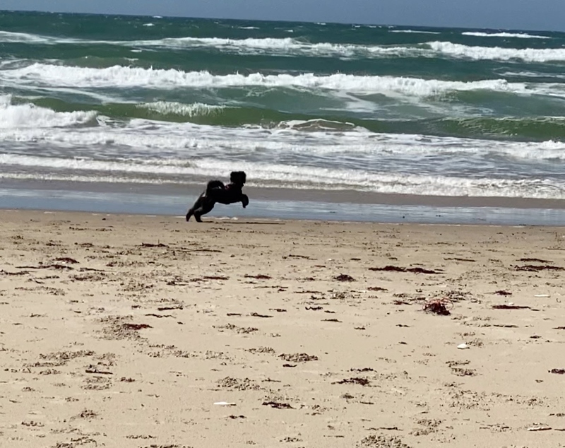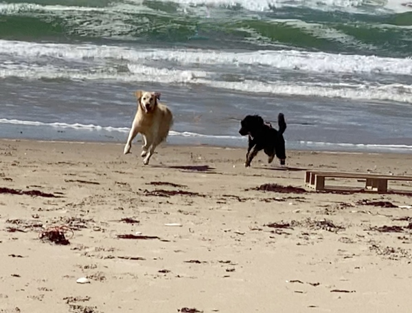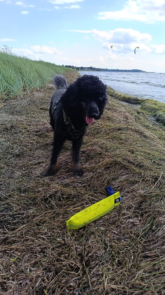 Irmi grüßt von der dänischen Nordseeküste. Sie ist sichtbar im Hundeglück. Da der Freilauf in den heimischen Feldern noch bis Ende Juli wegen der Brut- und Setzzeit verboten ist und die Schleppleine ihren Bewegungsdrang doch arg einschränkt, genießt sie das Herumtoben am Strand in vollen Zügen und nutzt auch gern das hiesige Agility-Angebot.