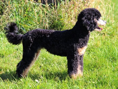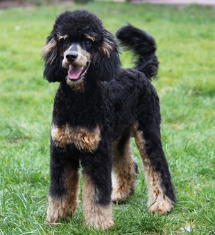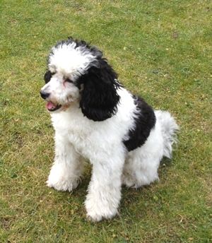 Hier ein Harlekinpudel mit Bärtchen und gleichmäßig langem Körperfell.