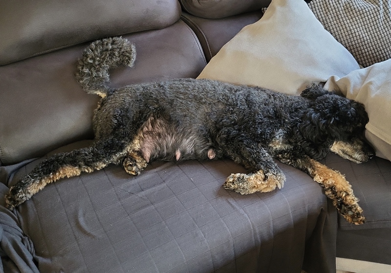 Vielleicht sind ihr die Neun noch zu wenig? Denn sie liegt mit dem Kopf auf Nymas Hund, das Bein schaut unter ihrem Kopf raus.