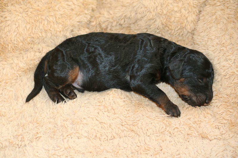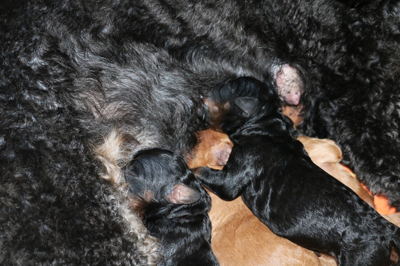 Als die ersten vier Mädels in Folge geboren wurden, haben wir uns gefragt wo die Rüden bleiben. Dann wurde der Erste geboren, danach kamen nochmals drei Damen hintereinander und mit Welpe Nummer neun gibt es nochmals männliche Unterstützung.