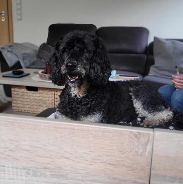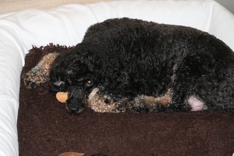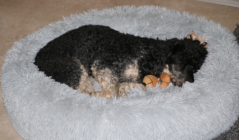 Beim Frischmachen des Welpennestchen hat es sich Mathilda auf meinem Bett im kleinen Welpenkörbchen bequem gemacht.