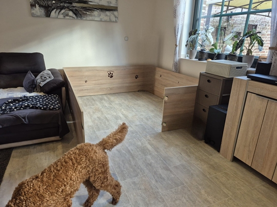 Die Welpenumrandung ist aufgebaut und jetzt brauche ich nur noch das Körbchen und ein paar Kleinigkeiten zu richten.